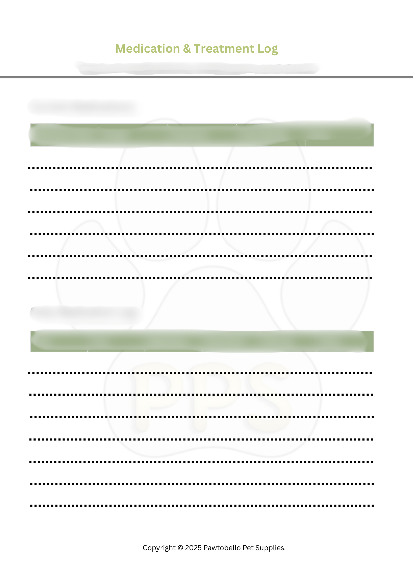Page 4: Medication & Treatment Log A tracking system for all medications, etc. Keeping accurate records that could be vital in emergency situations or when consulting with veterinary professionals.