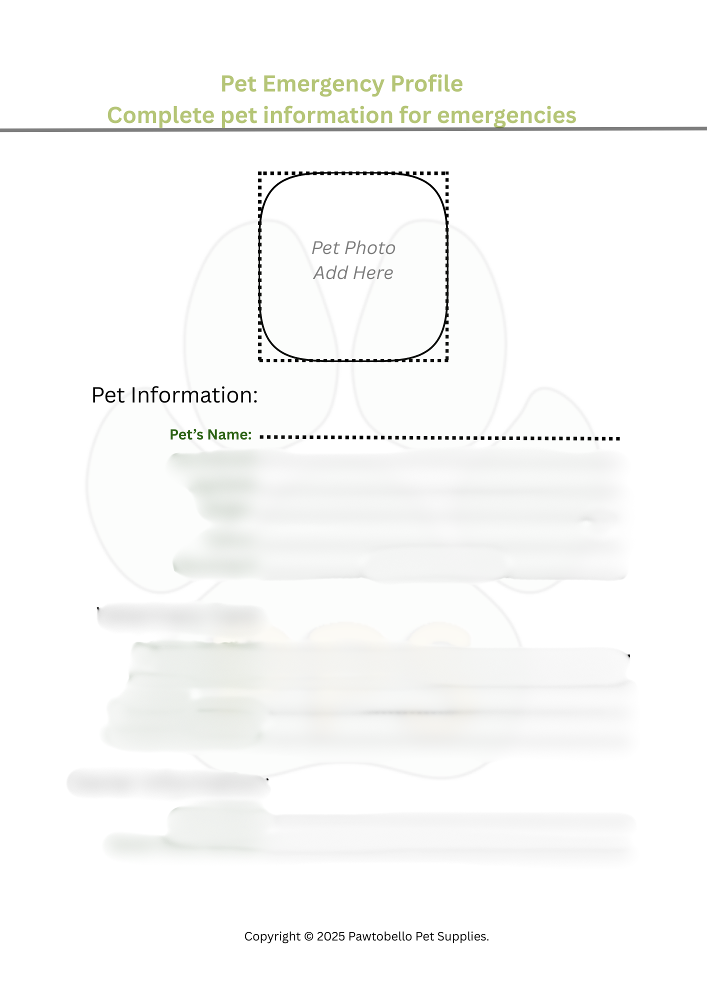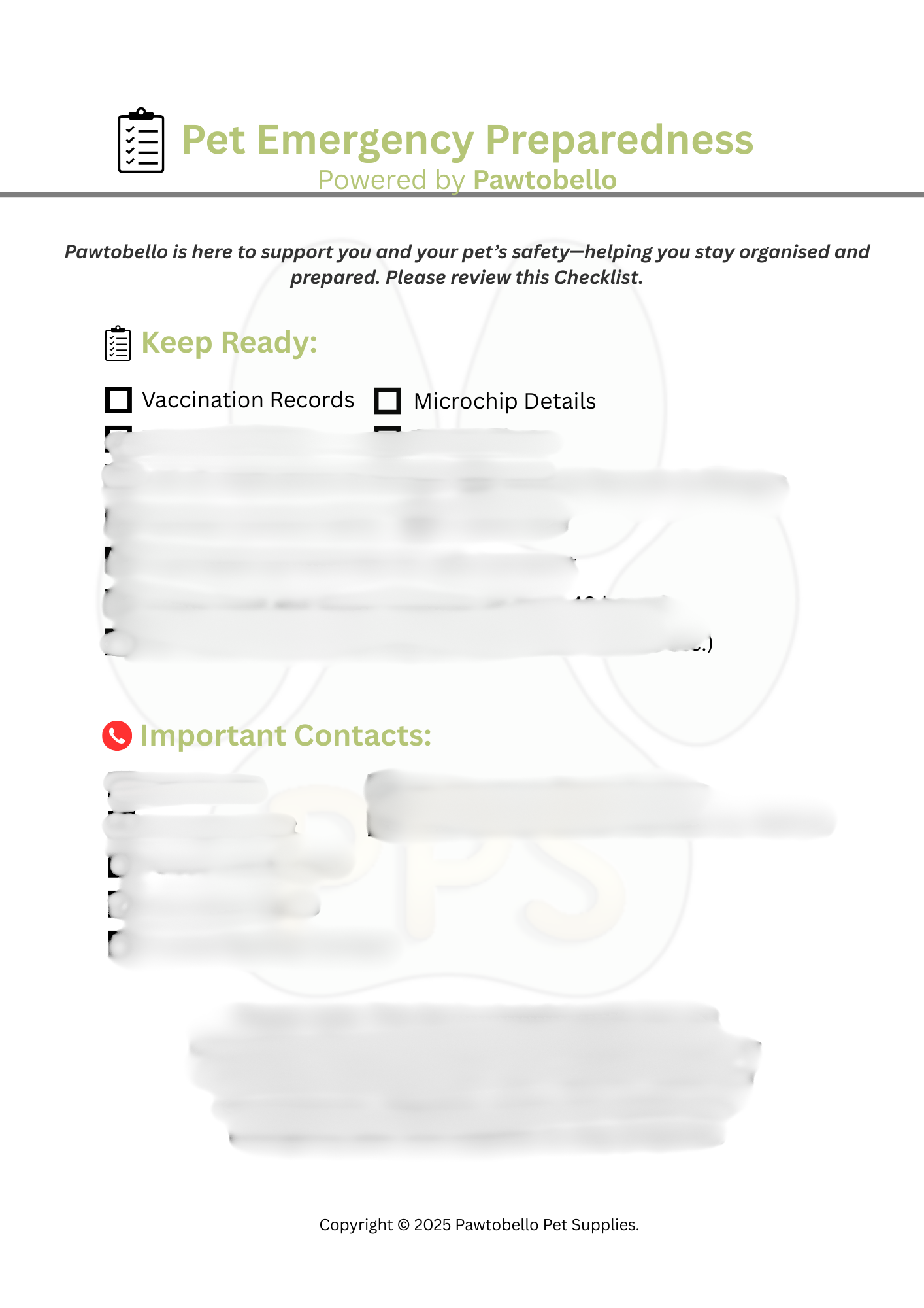 ⚠️Disclaimer⚠️ This Pet Emergency Preparedness Pack is designed purely as an organisational tool to help pet owners stay prepared and maintain important information about their pets. It is not intended to provide professional veterinary advice or replace veterinary care. Always consult with a qualified veterinarian for all medical concerns and emergency situations. The information and templates provided are for preparedness and organisational purposes only.